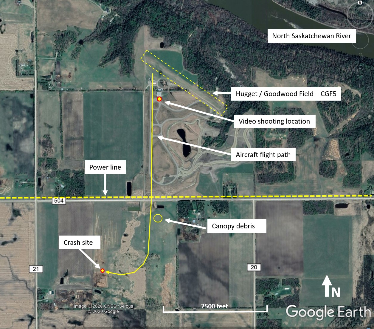 At about 1317Footnote 1 on 26 September 2020, the Harmon Rocket II amateur-built aircraft (registration C-FZXS, serial number 140) departed from Rocky Mountain House Aerodrome (CYRM), Alberta, for a flight to Hugget/Goodwood Field Aerodrome (CGF5), with 2 people on board. The purpose of the flight was to get to a gathering of friends, who were to spend the afternoon go-karting at the racetrack adjacent to the airfield. The aircraft arrived overhead of CGF5 at 1337 and proceeded to do 2 circuits around the field given that the pilot had never been to this location.