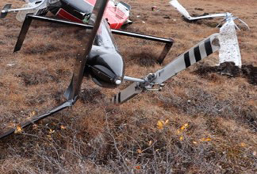 The helicopter sustained significant damage and was lying on its right side on an easterly heading. Most of the debris was located within a small area near the helicopter; however, pieces of the main-rotor blades were found further away. The main-rotor blade assembly and mast separated from the transmission and were found lying beside the helicopter. The engine exhaust duct and cowling were crushed, and deformation of the upper wire strike cutter indicated that the helicopter may have rolled almost 180° before falling back and coming to rest on its right side (Figure 1).