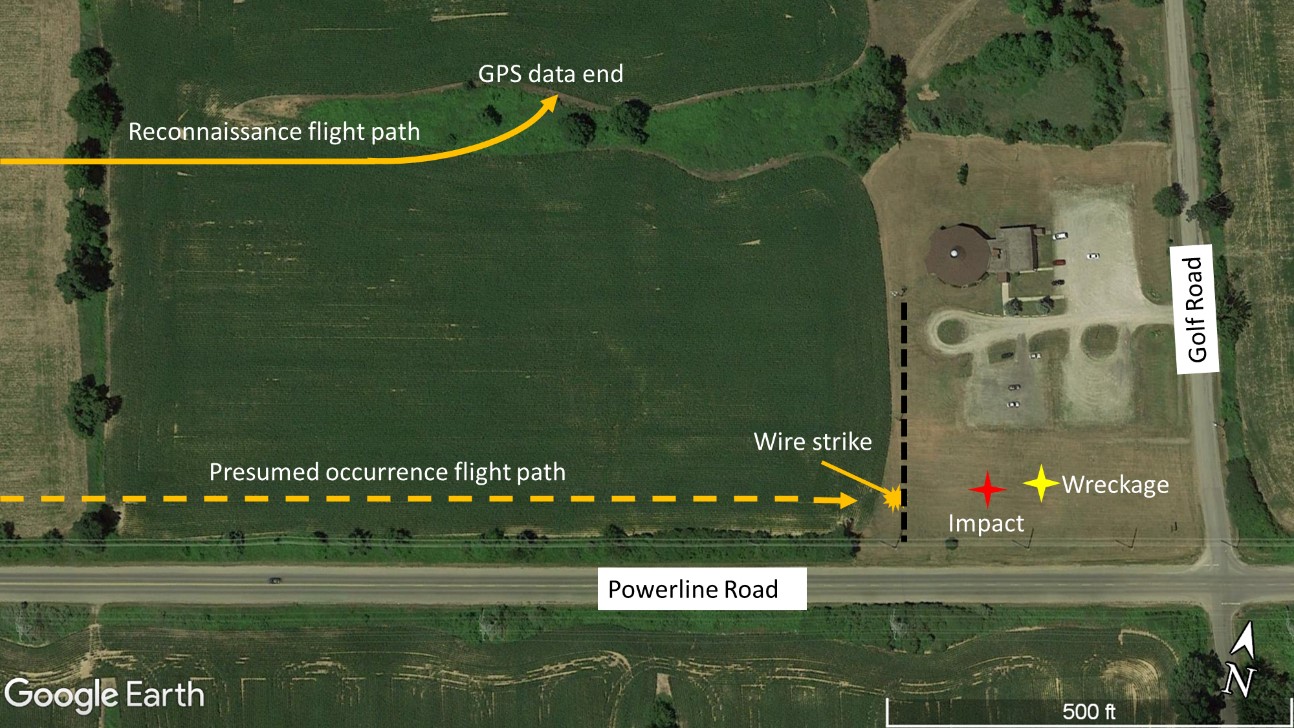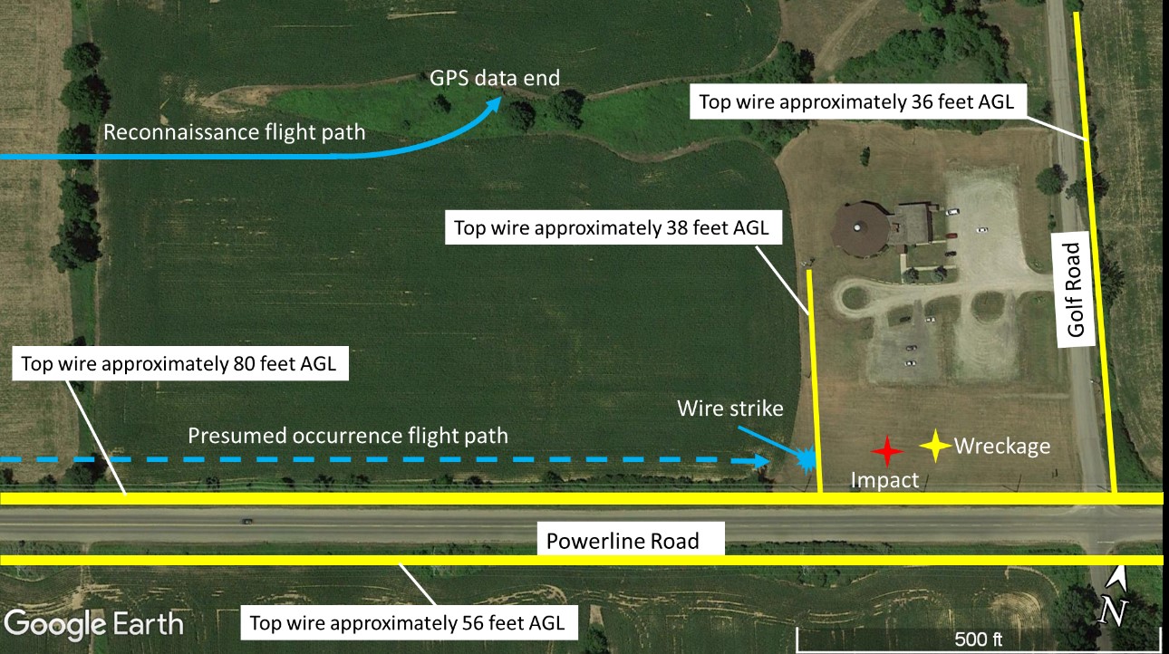 The wire strike occurred near the intersection of Powerline Road and Golf Road, at the boundary between the corn field and a church property located on Golf Road. Wires were running parallel to the occurrence flight path, on either side of Powerline Road, at heights of up to 80 feet AGL. There were also wires along Golf Road, 1000 feet to the east of the occurrence site; these were up to 36 feet AGL and parallel to the wires that were struck (Figure 5).
