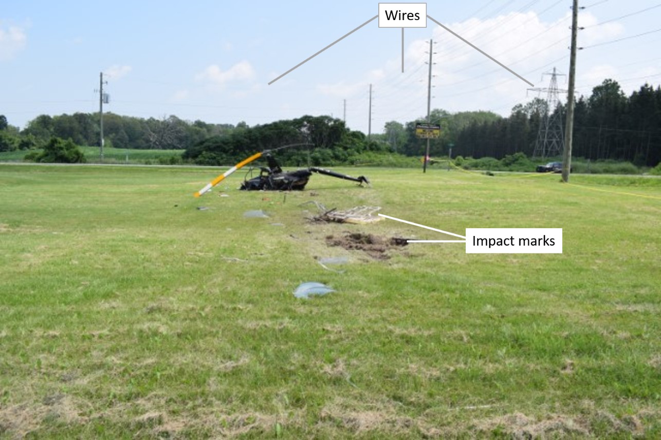 - The wires the helicopter struck were lower than other nearby wires, and were oriented along the edge of a corn field rather than the more common position alongside a road. As a result, in addition to the wires not being prominent, the pilot did not expect to encounter them in that location.