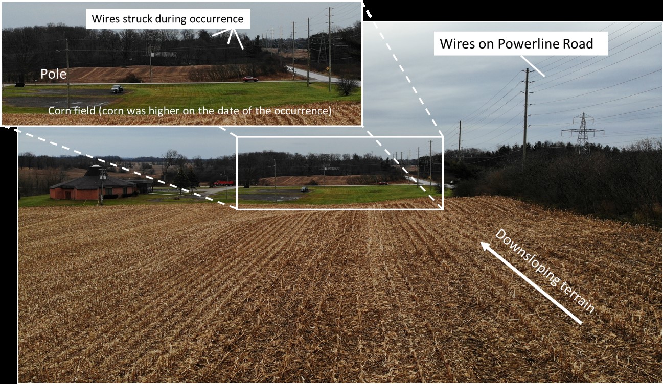 The wires that were struck were significantly less prominent. Instead of running along a roadside or the church driveway, they ran along the edge of a corn field, which is not where pilots expect to see them, nor where they focus on scanning for hazards. These wires were lower than the 2 prominent sets of wires running east to west, and the bases of their associated poles were obscured by the corn. Consequently, they were more difficult to detect from the air, especially when viewed from the west.