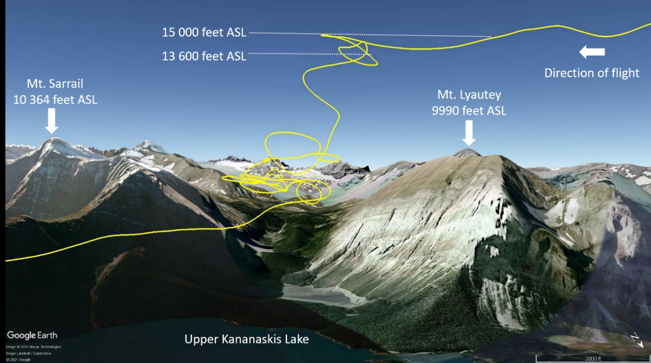 The pilot was able to see the terrain below as the aircraft descended through approximately 8500 feet ASL and control of the aircraft was regained at approximately 8100 feet ASL. At the time, the aircraft was in the Kananaskis Valley, where nearby mountain peaks extended up to 10 364 feet ASL (Figure 2). Flight visibility at the time was approximately 1 statute mile (SM), and improved to 2–3 SM as the pilot descended to approximately 7500 feet ASL, while flying toward Upper Kananaskis Lake.
