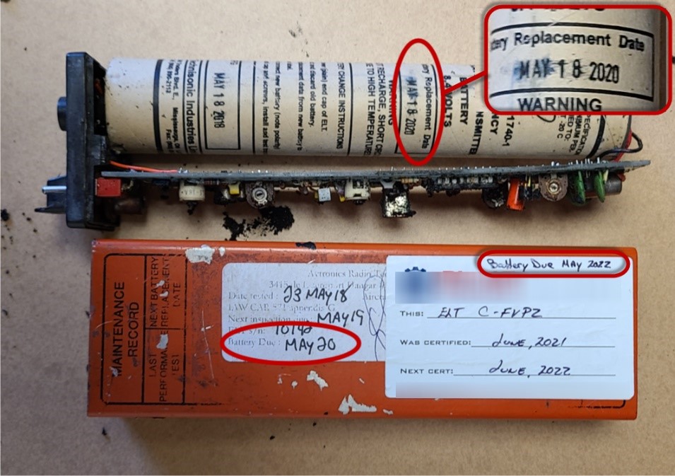 A more detailed examination by the TSB Engineering Laboratory in Ottawa, Ontario, revealed that the ELT functioned despite the low voltage in the internal battery. According to the tag affixed to the ELT when maintenance was last carried out in June 2021, the battery was due for replacement in May 2022. However, the replacement date indicated on the internal battery itself was 18 May 2020, which matches the date indicated on the tag affixed when the previous maintenance was carried out on 23 May 2018Footnote 4,Footnote 5 (Figure 4).