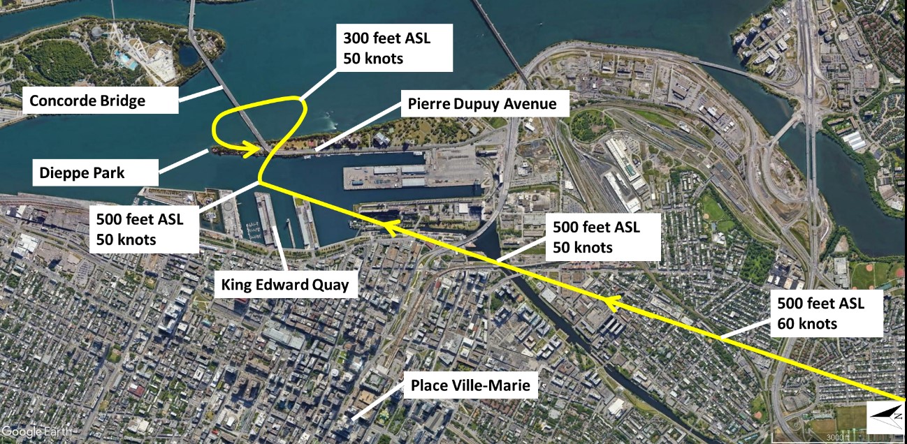 After the aircraft crossed the river, it turned right and headed north-northeast. The aircraft was still flying at an altitude of 500 feet ASL and was heading toward the Old Port of Montréal. At approximately 1759, shortly after flying by Place Ville-Marie, the aircraft turned to the east near the King Edward Quay to return to CML8 because it was not able to climb to a higher altitude. The aircraft then proceeded eastward, crossing over Dieppe Park on the south side of the Concorde Bridge.