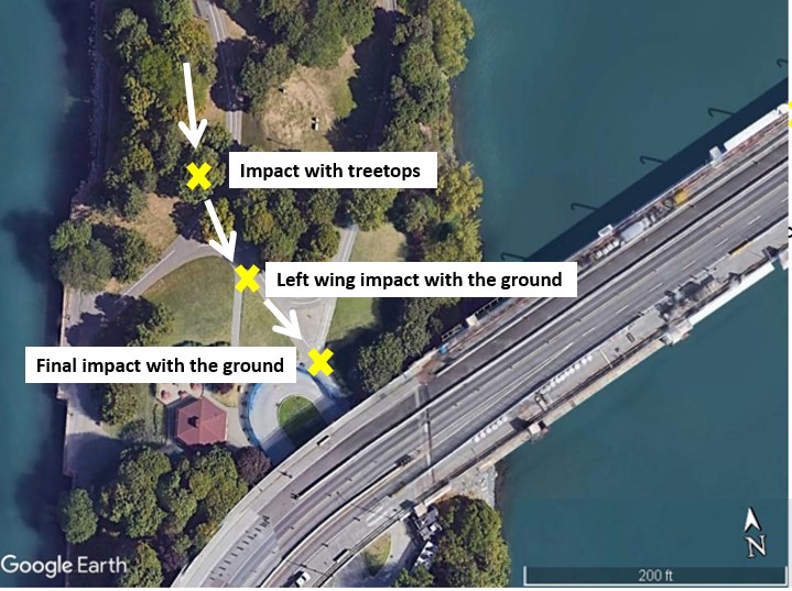 - After the loss of engine power at low altitude, the aircraft turned left to attempt to land on Pierre-Dupuy Avenue. While the aircraft was in the turn, the left wing grazed treetops, the aircraft began to cartwheel, and it struck the ground. There was a post-impact fire, and the aircraft was destroyed.