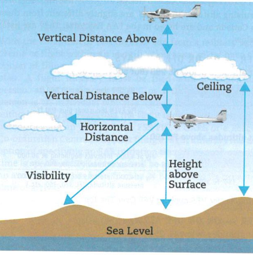 To meet the minimum weather conditions for VFR flight in controlled airspace, the aircraft had to maintain the required minimum distances from cloud: 500 feet vertically and at least 1 mile horizontally. However, during the occurrence flight, the pilot, who had planned to fly at an altitude of 1200 feet above sea level (ASL), stated in his communications with the Montréal and St-Hubert control towers that he was waiting to be clear of the clouds to climb to the planned altitude, yet he continued to head toward his target point at an altitude of 500 feet ASL.
