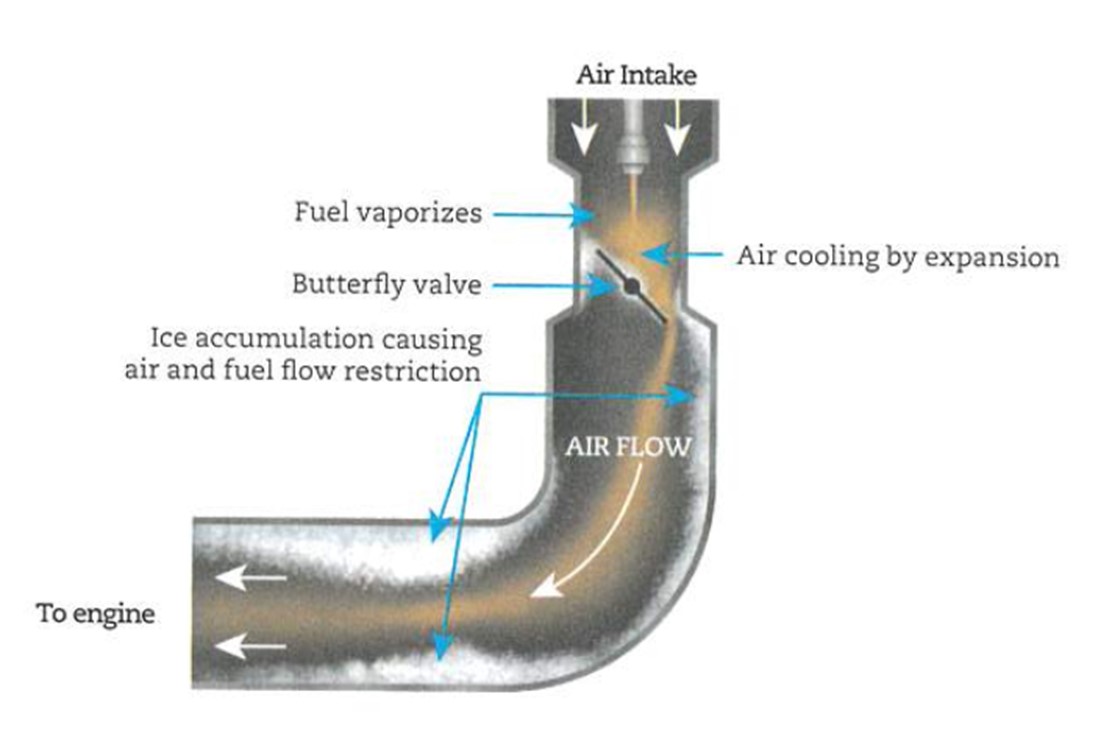 Carburetor icing is a phenomenon where water vapour in the air freezes and adheres to internal surfaces of the carburetor (Figure 4). This occurs because the temperature of the air entering the carburetor is reduced by the effect of fuel vaporization and by the decrease in air pressure caused by the Venturi effect. If the air temperature in the carburetor drops below freezing, ice may form on internal surfaces of the carburetor, including the throttle valve. As ice forms, this increases the Venturi cooling effect due to narrowing of the carburetor throat. This narrowing limits the flow of the fuel-air mixture, reducing the power output. Carburetor icing usually results in a loss of power and engine roughness. If enough ice accumulates, it can cause an engine failure.