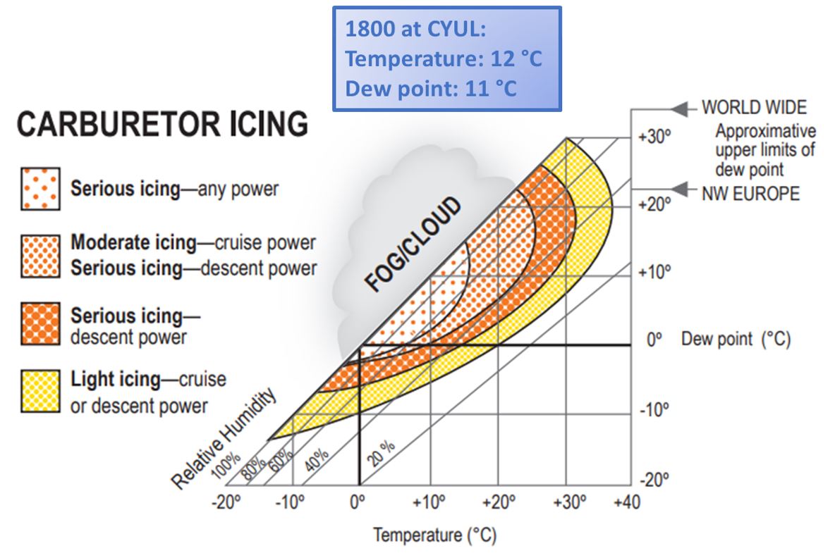 According to the above diagram, the temperature and dew point in the Montréal area at the time of the occurrence were conducive to serious carburetor icing at any power.