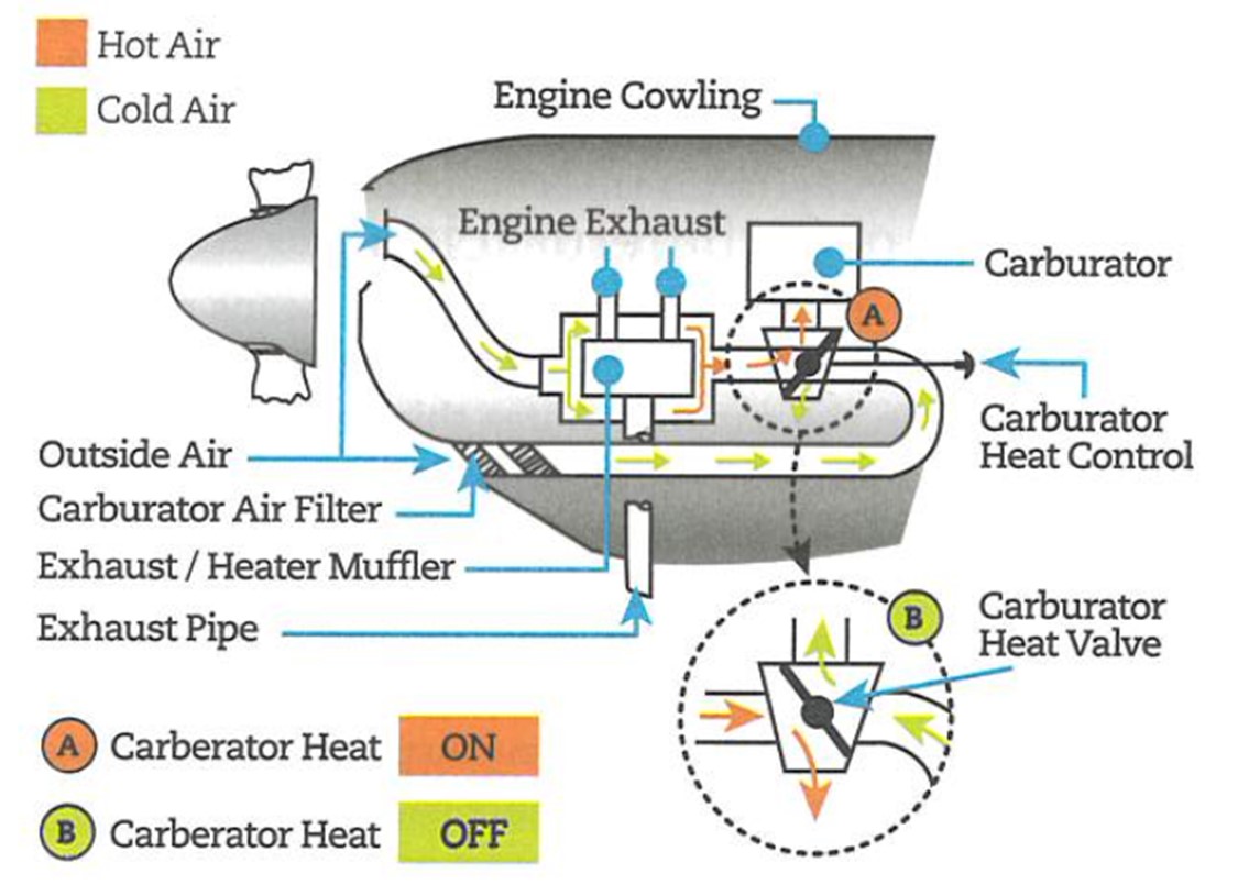 To avoid carburetor icing, aircraft are equipped with a device that heats incoming air to prevent ice buildup. The carburetor heating control channels the heated air to the carburetor air intake to maintain the fuel–air mixture above the freezing point and avoid the formation of ice in the carburetor (Figure 6). Ideally, this is done as a preventive measure. However, once ice has formed in the carburetor, the carburetor heat must be turned on to melt it.