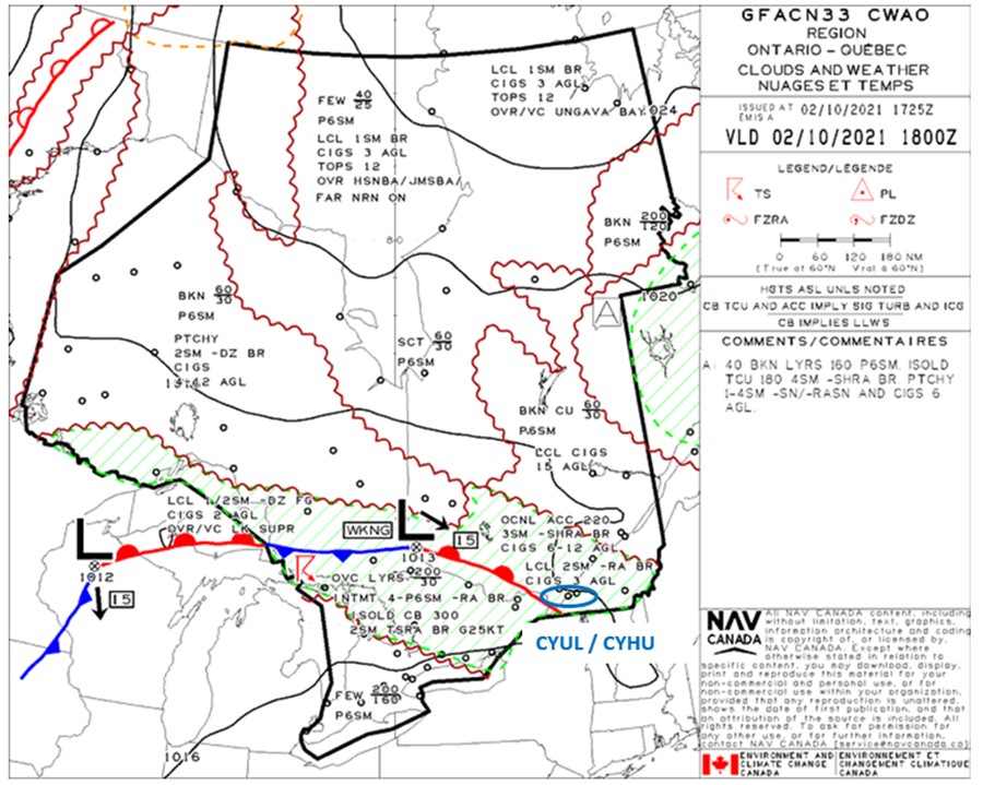 Graphic area forecasts (GFA) indicate the future weather conditions for a given geographic area.Footnote 7 On the day of the occurrence, a Clouds and Weather chart, issued at 1325 and valid as of 1400, showed a weakening low-pressure system to the north of North Bay, Ontario, moving southeast at a speed of 15 knots. This system included a warm front extending along the Quebec–Ontario border, on the Quebec side (Appendix A).