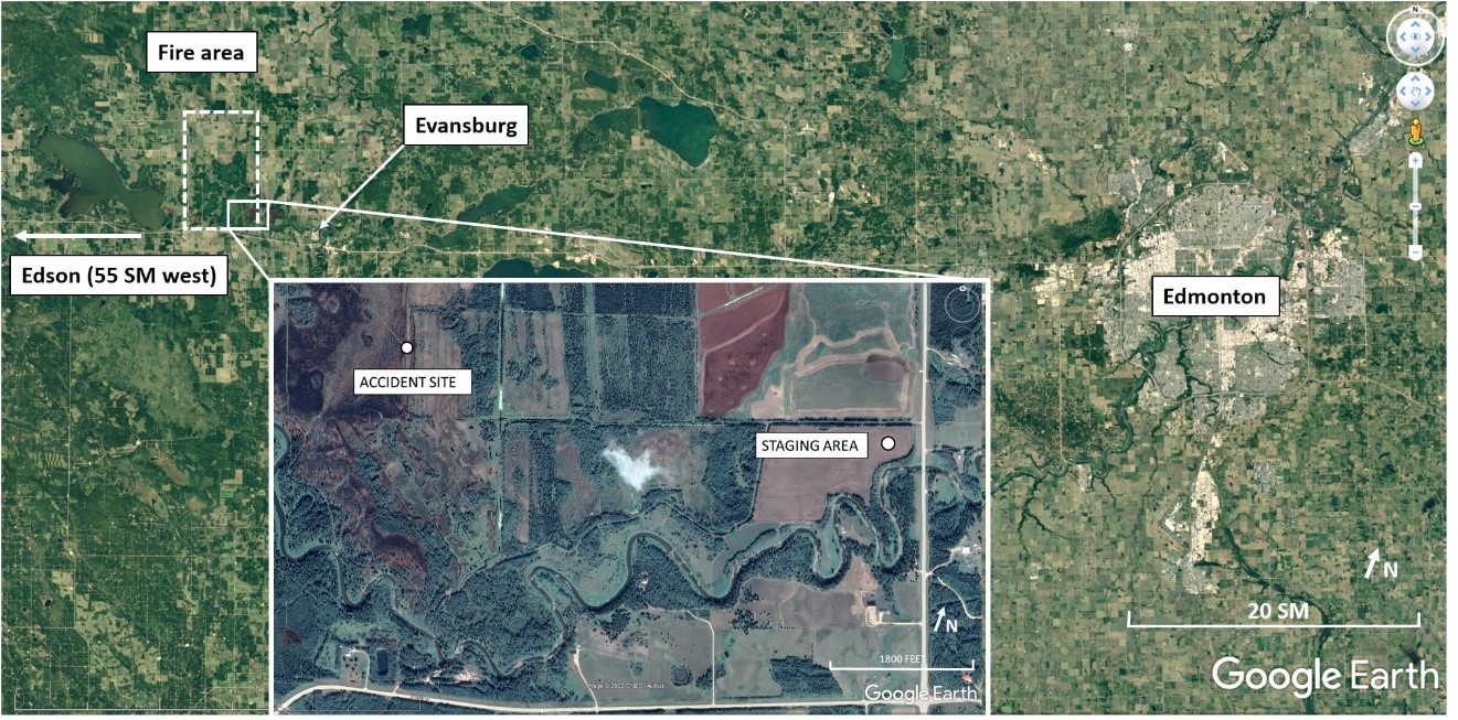 At approximately 1000Footnote 1 on 28 June 2021, the Yellowhead Helicopters Ltd. (Yellowhead Helicopters) Bell Textron Inc. (Bell) model 212 helicopter (registration C-GYHQ, serial number 30933) departed Edson Airport (CYET), Alberta, in support of fire fighting efforts on wildfire EWF-075, located 4 nautical miles (NM) west-northwest of Evansburg, Alberta. The helicopter arrived on scene at approximately 1025 to begin bucket support operations. These operations concluded at approximately 1246 and the pilot returned to the staging area to wait for his next assignment (Figure 1).
