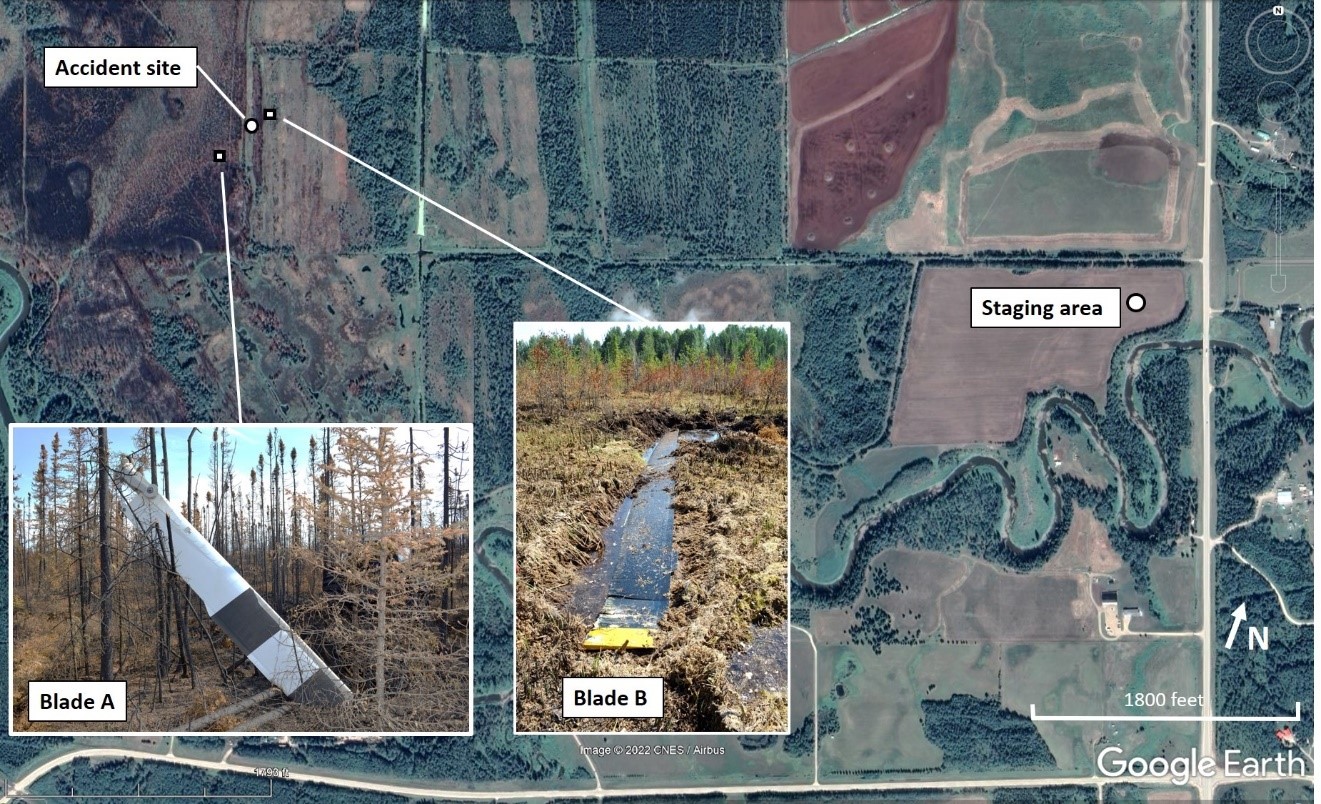 On 28 June 2021, the Yellowhead Helicopters Ltd. Bell Textron Inc. model 212 helicopter (registration C-GYHQ, serial number 30933) was conducting operations in support of forest fire fighting efforts approximately 4 nautical miles west-northwest of Evansburg, Alberta. At approximately 1800 Mountain Daylight Time, the helicopter departed the staging area to complete a series of 3 flights transporting groups of forest fire fighters back to the staging area. The first 2 trips were completed uneventfully. During the last trip, as the helicopter was approaching the landing area to pick up the final group of fire fighters, one of the main rotor blades separated from the rotor head assembly. The second rotor blade and rotor head assembly then broke free from the helicopter and the helicopter crashed. The pilot, the sole occupant on board, was fatally injured. There was a post-impact fire that destroyed the helicopter. A signal from the 406 MHz emergency locator transmitter was not received.