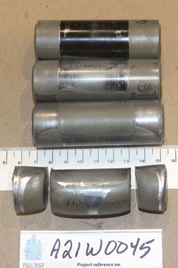 Metallurgical analysis of the 4 pins (part number 204-012-104-005) revealed that the failed pin (serial number FNFS90, bottom of Figure 7) was manufactured from 316 stainless steel, whereas the other 3 pins (serial numbers FNFS49, FNFS54, and FNFS75) were manufactured from H11 tool steel. The TSB Rockwell hardness test of the failed pin averaged 7.6 on the C scaleFootnote 2 (see section 1.18.2.4 Detailed inspection and hardness test).