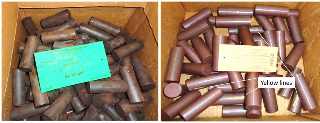 A normal part of the receiving inspection process is a visual inspection of the parts being received. As shown in Figure 10, there is a distinct difference in the visual appearance of the raw pin blanks (H11 tool steel vs. 316 stainless steel) being returned from the heat treatment vendor. In addition, the pins that did not meet the hardness specification were identified with a yellow line marked down the side of the pin.