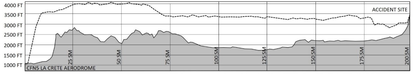 The aircraft departed at 0900 in visual meteorological conditions and initially climbed to 3500 feet ASL on a southerly heading (figures 1 and 2). Along the route to CYZH, the aircraft reached an altitude of 4000 feet ASL before descending, likely due to cloud ceilings. When the aircraft was 14 nautical miles (NM) north of CYZH, the pilot changed the destination in the GPS (global positioning system) from CYZH to CYLL. The aircraft’s track then turned to the east toward CYLL and toward rising terrain. At this time the aircraft was at 3000 feet ASL or 500 feet above terrain.