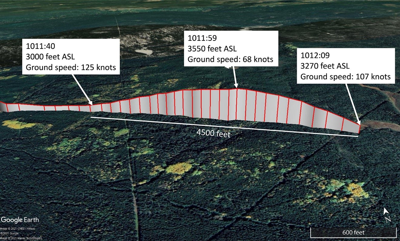 At 1011:40, the aircraft climbed to 3550 feet ASL and its ground speed decreased from 125 knots to 68 knots. The aircraft then started a descent at 1011:59 and descended until shortly after 1012:09, when it impacted terrain in a wooded area at approximately 3200 feet ASL (Figure 3). GPS data from the digital engine monitorFootnote 2 showed that the aircraft’s descent angle before it hit trees was about 15°. The average descent rate was 1680 fpm until a few seconds before impact, when it increased to over 2000 fpm. The pilot was fatally injured. The aircraft was destroyed. The emergency locator transmitter activated.