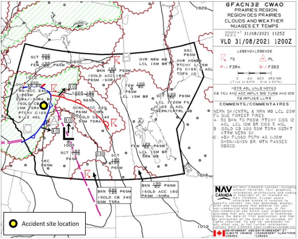At 0816,Footnote 1 the pilot called the Edmonton Flight Information Centre to file his VFR flight plan. The planned route was from CFN5 to Slave Lake Airport (CYZH), Alberta, then to Lloydminster Airport (CYLL), Alberta, and finally to CYXE. The planned altitude for the flight was 5500 feet above sea level (ASL). During the call, the flight service specialist offered to provide a weather briefing, but the pilot declined and informed the specialist that he had already retrieved weather information for the airports along the route and concluded that the conditions met VFR minima; however, he recognized that it might not be possible to reach his planned altitude owing to clouds.
