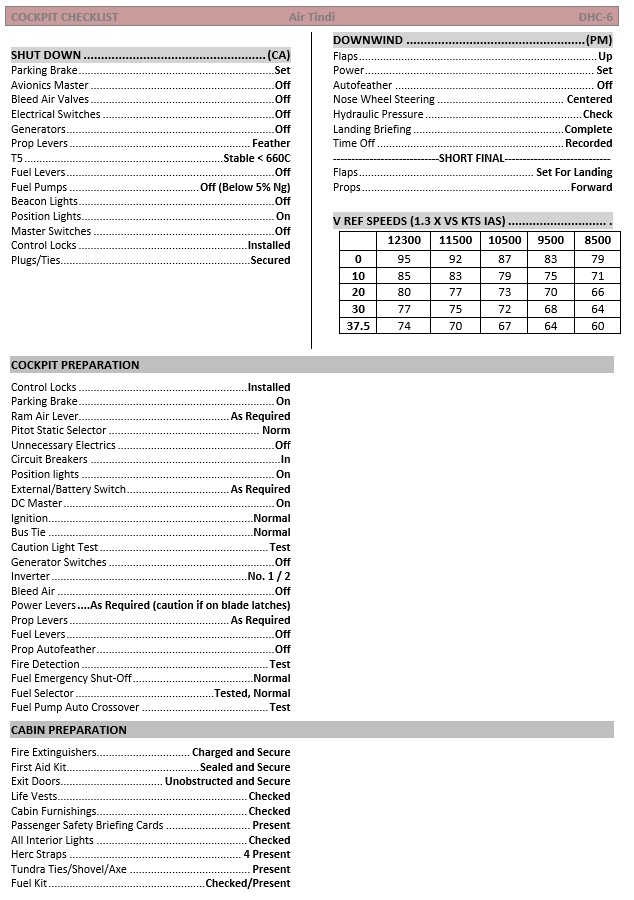 Appendix B – Air Tindi DHC-6 cockpit checklist