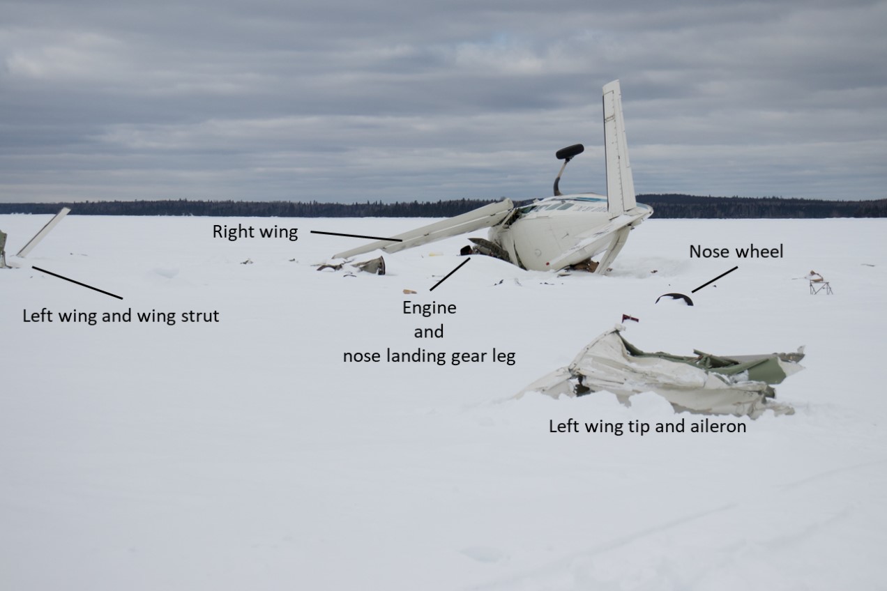 The aircraft collided with the snow-covered frozen surface of Lac Seul at an elevation of approximately 1100 feet ASL, in a nose-down, left-wing-low attitude. The 2 to 3 feet of snow cover on the ice surface reduced the forces generated by the collision. The aircraft cockpit and cabin remained largely intact and provided a survivable space. The wreckage trail was approximately 550 feet long and oriented about 310°T, which is roughly 40° to the left of the direct bearing (350°T) from CYXL to the ice runway at Springpole Lake.