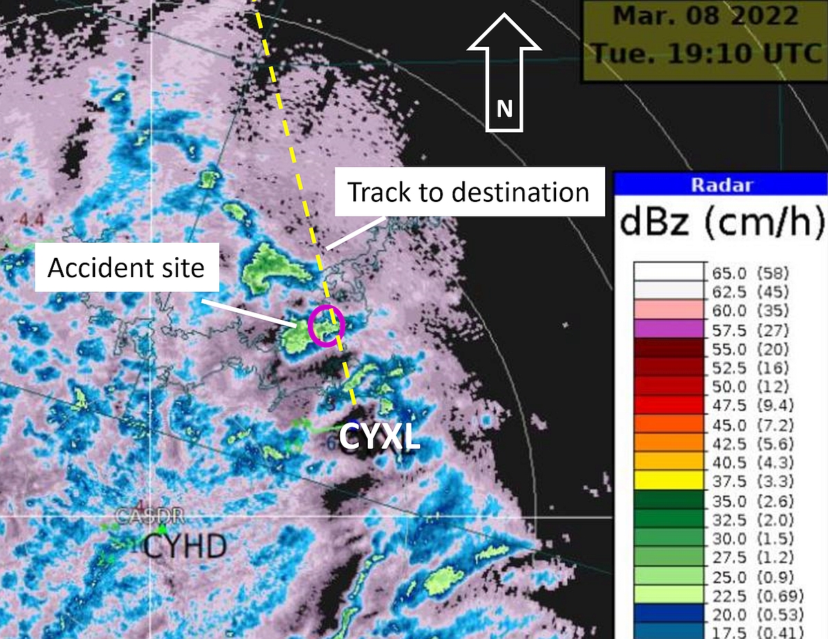 Between 1300 and 1310, a convective cell with higher radar reflectivities and echo tops up to 9000 feet ASL indicated that the visibility and ceiling were even lower at the crash site compared to what had been reported and observed at 1255 at CYXL.