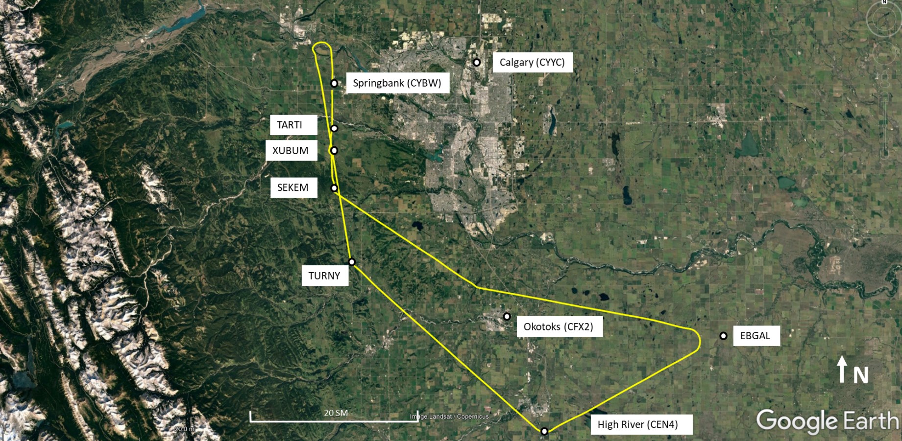 After takeoff, the aircraft turned left toward the TURNY waypoint, climbing to a cruising altitude of 9000 feet above sea level (ASL). It flew over High River Aerodrome (CEN4), Alberta, and headed northeast toward the EBGAL waypoint. The aircraft then turned left and proceeded back toward the TURNY waypoint. When the aircraft was flying just northwest of Okotoks (CFX2), Alberta, at an altitude of approximately 8000 feet ASL, it turned slightly to the right to cross the initial approach waypoint (SEKEM) and return to CYBW for an instrument approach and landing on Runway 35 (Figure 1).