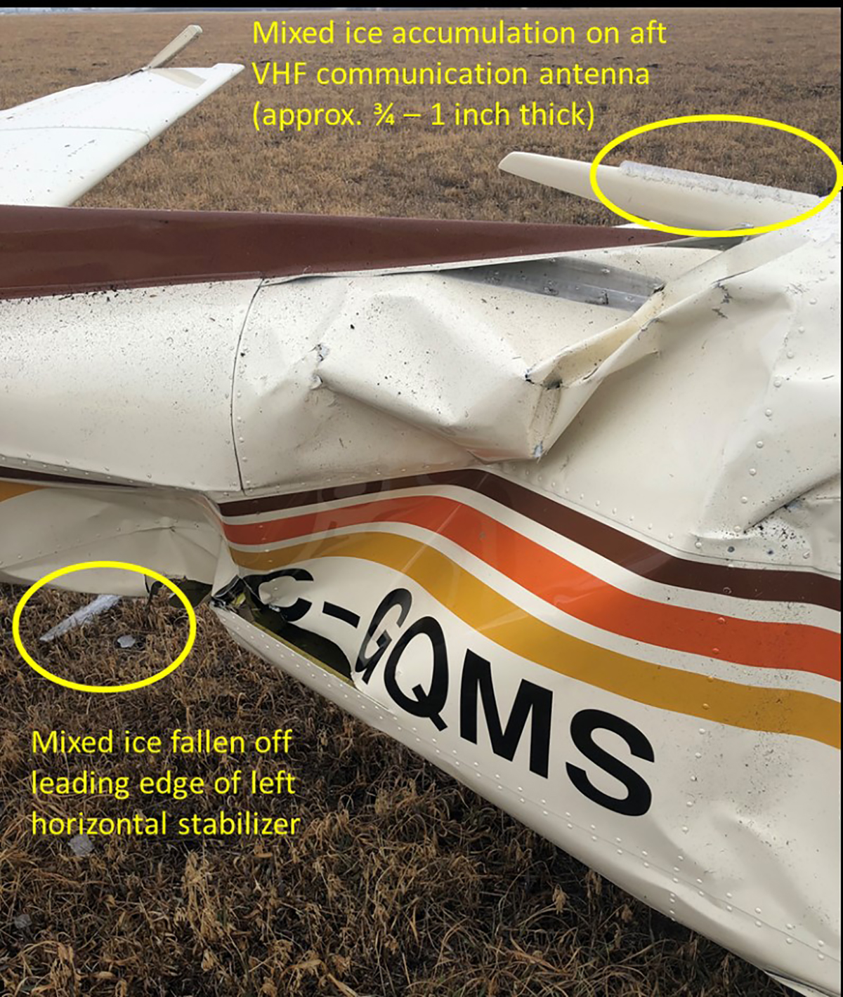 RCMP (Royal Canadian Mounted Police) officers from the Cochrane detachment responded shortly after the accident. Several photos were taken of the exterior of the aircraft and shared with the TSB. The photos revealed a build-up of mixed ice on the aft VHF (very high frequency) communication antenna, the leading edges of the horizontal stabilizer, and the leading edge of the left wing (figures 3 and 4). The investigation estimated the build-up of the mixed ice on the VHF communication antenna to be between ¾ and 1 inch thick.