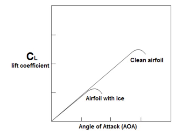 As described in AC 91-74B, the accumulation of even a small amount of ice on an airfoilFootnote 8 in flight significantly reduces the maximum amount of lift available at any given airspeed or angle of attack, and significantly reduces the angle of attack at which a stall occurs (Figure 5). It is not unusual for the maximum coefficient of lift to be reduced by 30%.Footnote 9