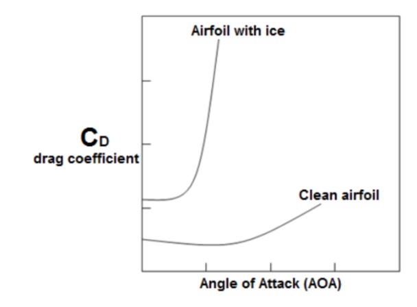 An aircraft with a completely unprotected wing is unlikely to be certificated for flight in icing conditions, but may inadvertently encounter icing conditions. […] The ice causes an increase in drag, which the pilot detects as a loss in airspeed or an increase in the power required to maintain the same airspeed. (The drag increase is also due to ice on other parts of the aircraft). The longer the encounter, the greater the drag increase; even with increased power, it may not be possible to maintain airspeed. If the aircraft has relatively limited power (as is the case with many aircraft with no ice protection), it may soon approach stall speed and a dangerous situation.Footnote 11