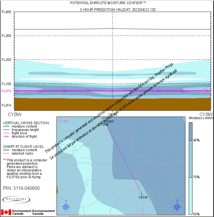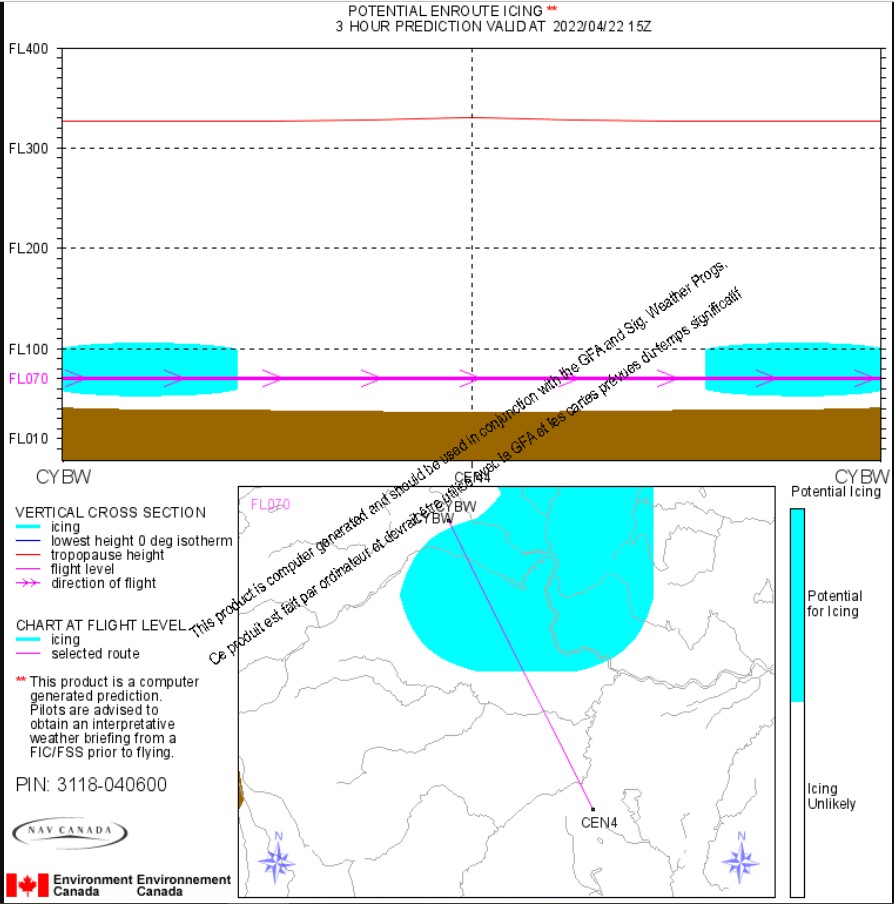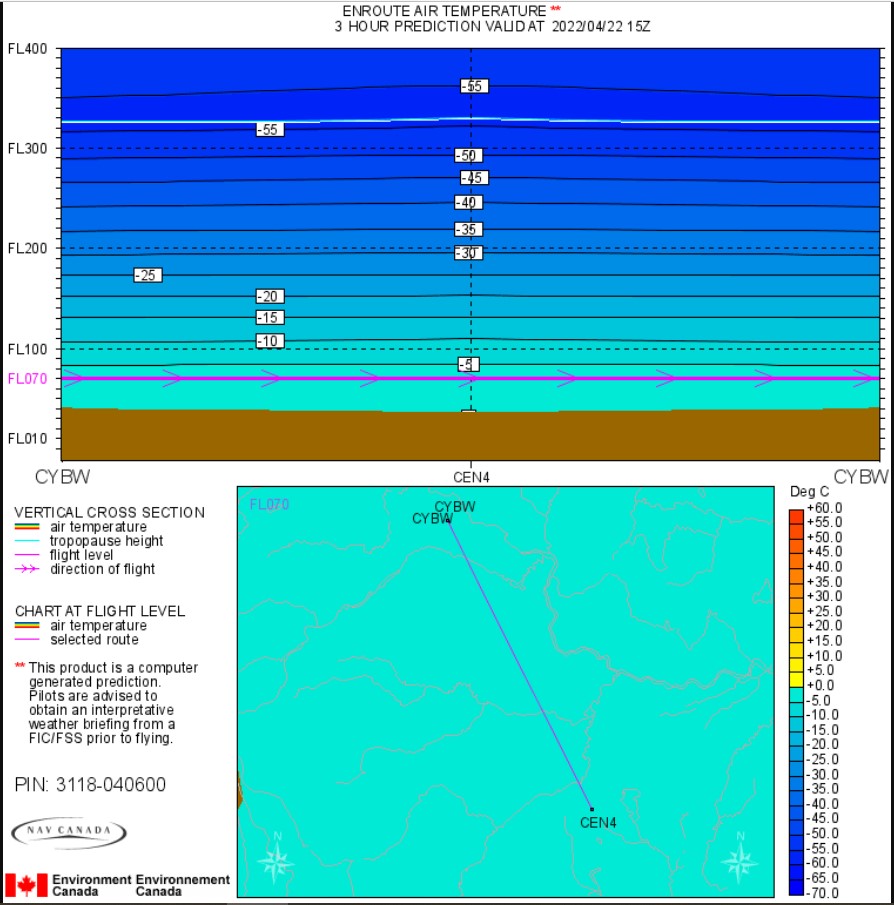 In addition to the weather information products mentioned above, pilots can consult NAV CANADA’s automated supplementary enroute weather predictions (ASEP) page from the Aviation Weather Web Site.Footnote 5 Appendix A provides samples of the graphic depictions of the conditions between 0900 and 1200 on the day of the occurrence. These graphics depict the potential for an aircraft to experience in-flight icing in the vicinity of the planned flight route and at the planned altitude.