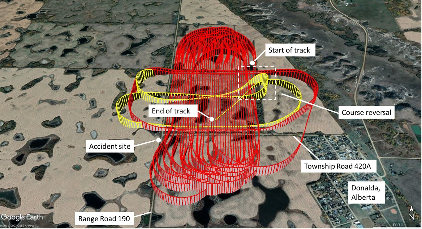 The company’s flight operations manual provides no guidance on bank angles and climb rates during course reversals other than to say that they must be done in accordance with the Canadian Aviation Regulations and the National Aerial Pesticide Application Manual.Footnote 4 Over the 2 flight days before the accident day, the aircraft’s AG NAV unit recorded the occurrence pilot performing multiple course reversals at low altitude with steep climbs and turns, which if coordinated, would have required bank angles in excess of 45°.
