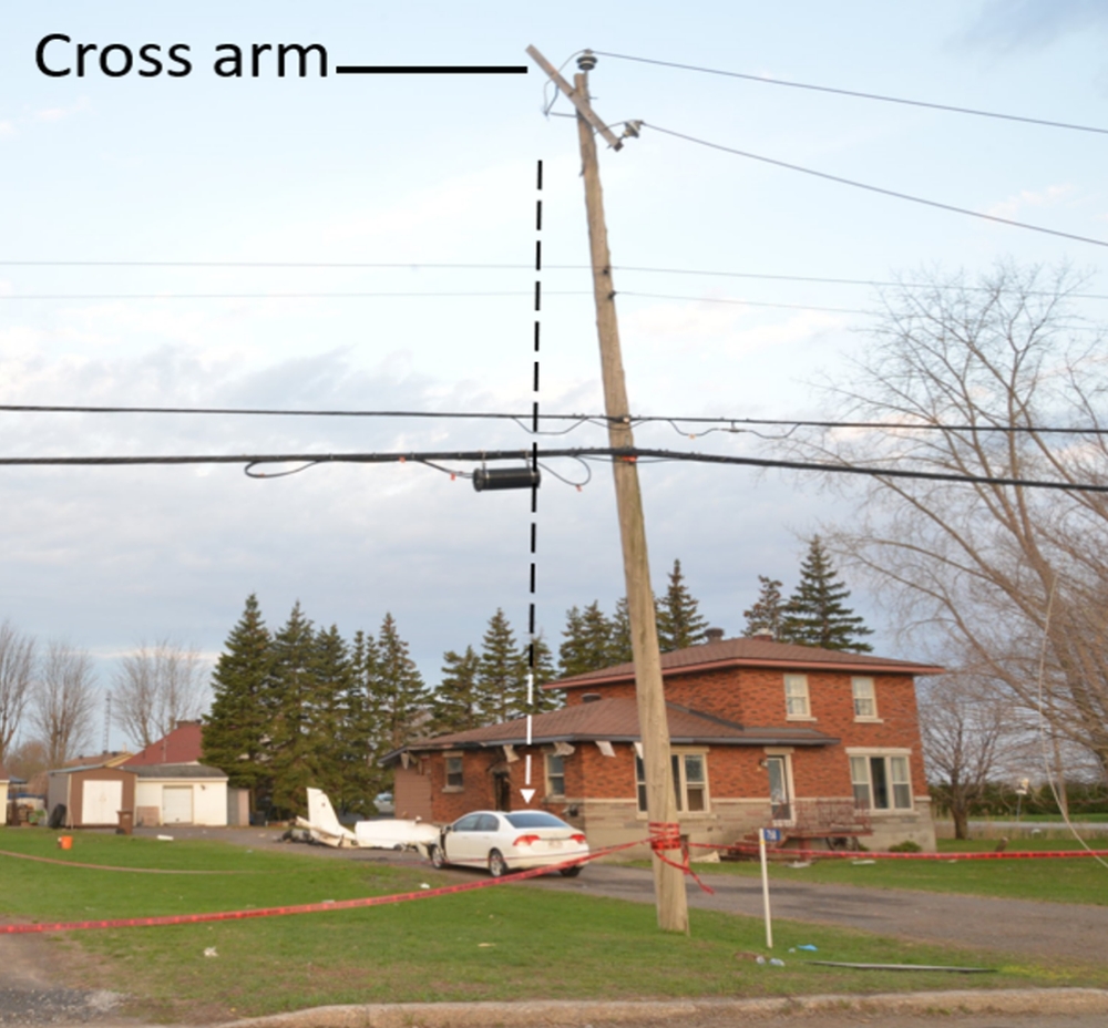The angle formed by a line drawn between the top part of the hydro pole near the house and the automobile was approximately 45° (Figure 1), suggesting that the aircraft’s horizontal speed was low when it collided with the power lines.