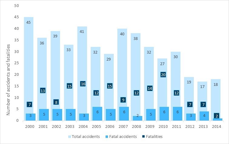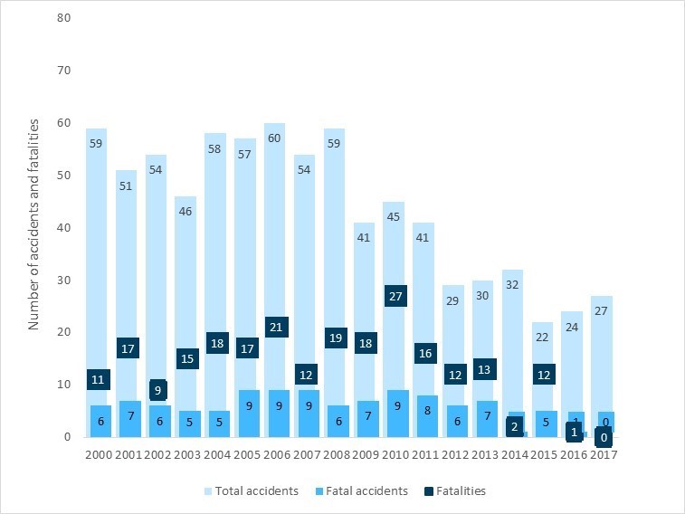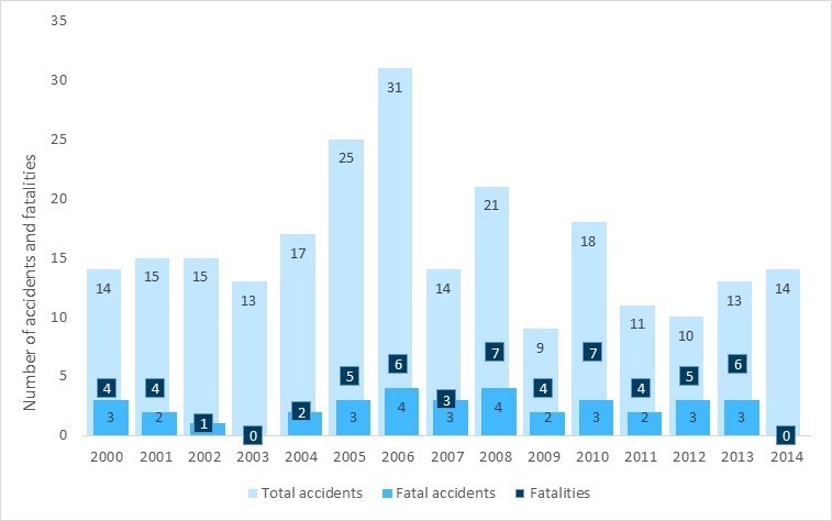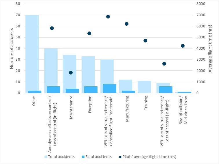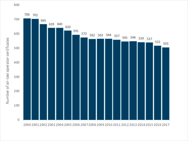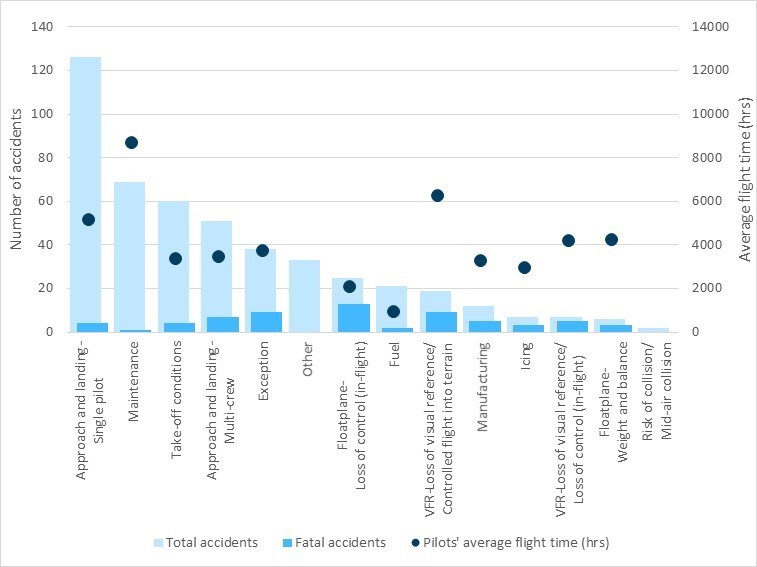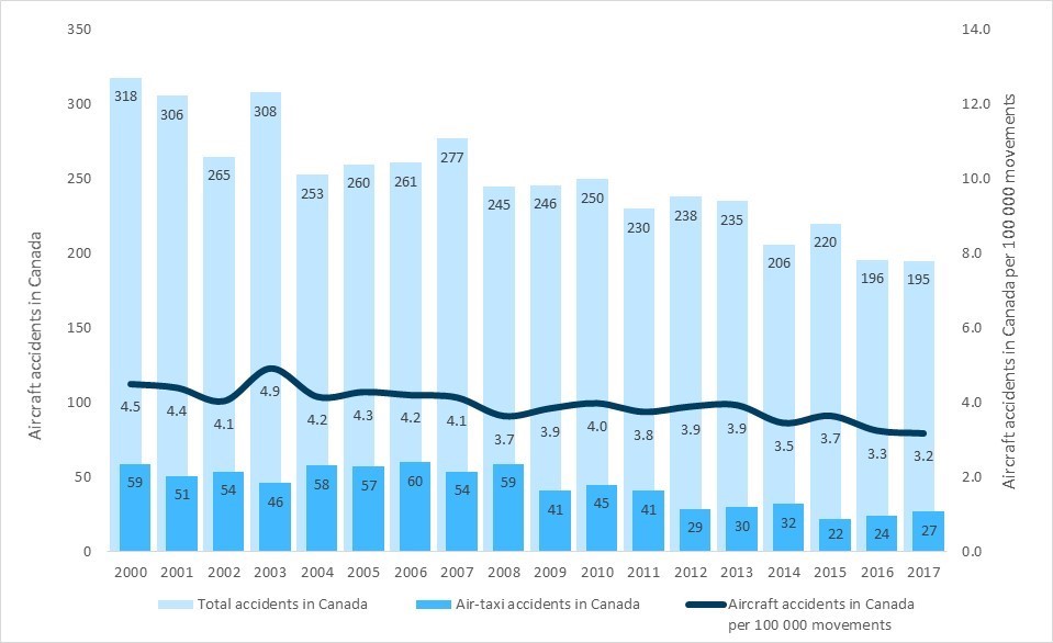 The air-taxi sector has more accidents and more fatalities than all other sectors of commercial aviation in Canada. The numbers speak for themselves. In the 18-year period from 01 January 2000 to 31 December 2017, there were 789 accidents in the air-taxi sector, resulting in 240 fatalities—representing 55% of all accidents in commercial air services in Canada and 62% of the fatalities in this period (Figure S1).