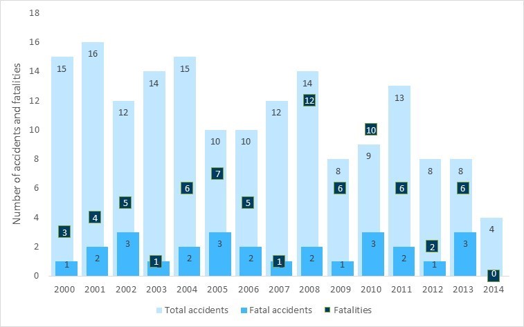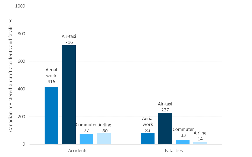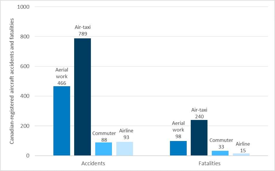 By contrast, during the same period, airline operations in Canada Footnote 2 experienced only 93 accidents (6% of the total) and 15 fatalities (4% of the total).