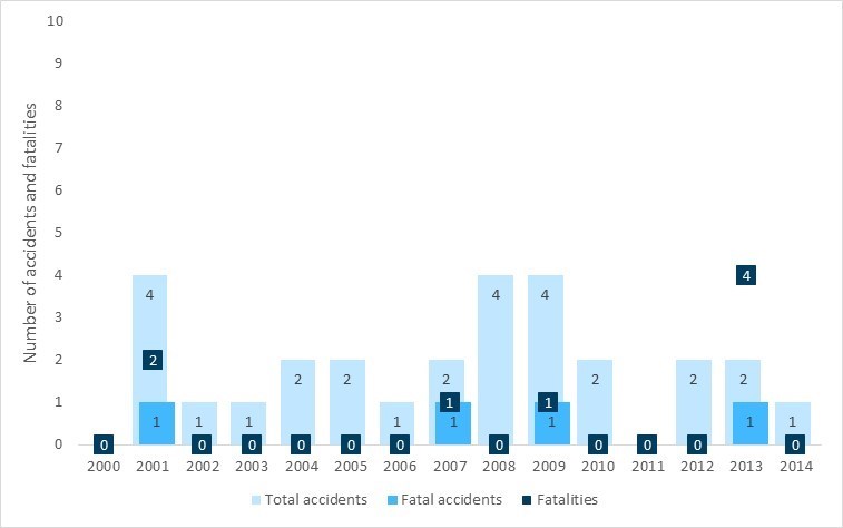 Statistical analysis showed a downward trend in the total number of air-taxi accidents during the study period. However, there was no similar downward trend in the number of fatal accidents or fatalities over this period.