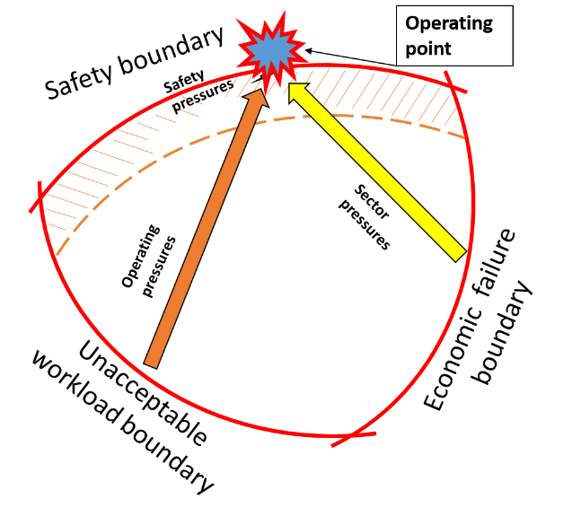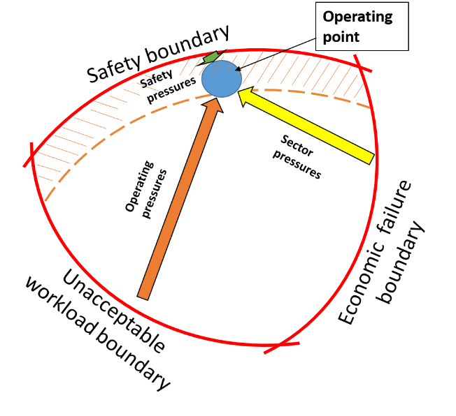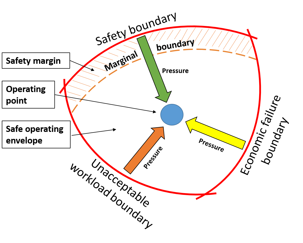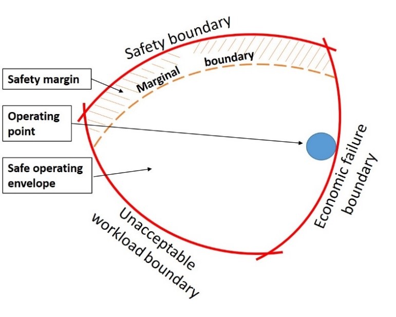 The marginal boundary depicts the depth of the safety margin: the fewer or weaker the defences in place, the thinner the safety margin. As the operating point crosses over the marginal boundary, the safety of the operation diminishes until the operating point crosses the safety boundary, where a failure (an accident or incident) occurs.