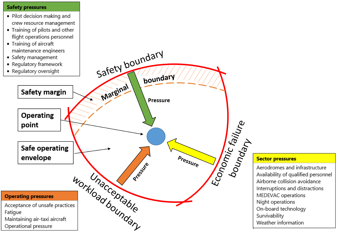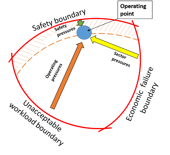 In this model, the air-taxi sector (or an individual operator) is represented by the operating point (the blue circle), and its position is determined by how hazards and risks are managed. As a result, the operating point is constantly moving. If it crosses any of the boundaries of the safe operating envelope, the system breaks down. The boundaries are
