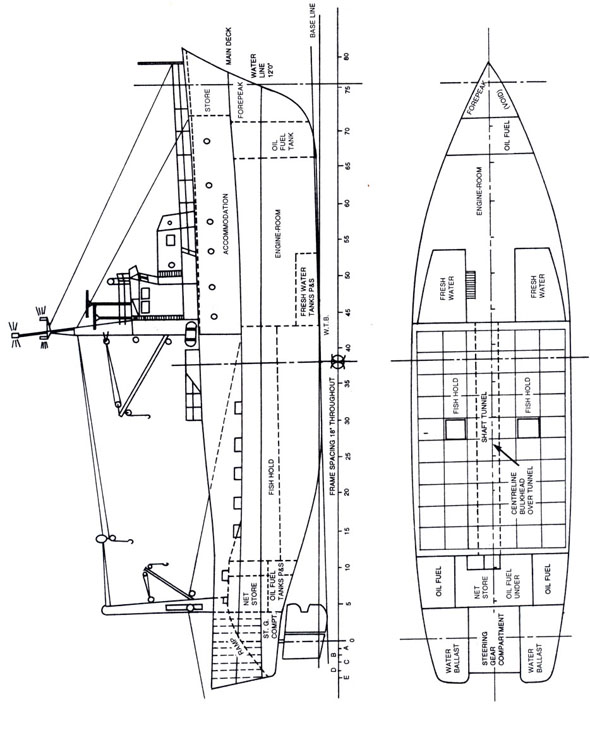 Although built as a trawler, the "NADINE" was converted into a seiner during her middle years and then reconverted to a trawler in the latter part of her working life. During the final reconversion, the vessel's original design appears to have been faithfully reproduced except for the placement of the trawl warp winches, which were relocated forward of the fish hold hatches (see Appendix A).