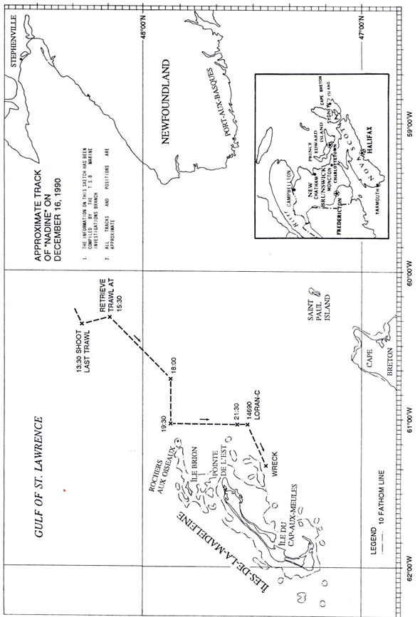 At about 1530 on 16 December, the "NADINE" completed her final trawl and departed for her home port, Cap-aux-Meules, with a catch of approximately 330,000 lb. (149.7 t) of redfish. Because heavy seas were constantly washing the afterdeck, the crew elected to leave approximately 14,500 lb. (6.6 t) of fish from the last catch in the trawl on the afterdeck instead of stowing it in the fish holds.