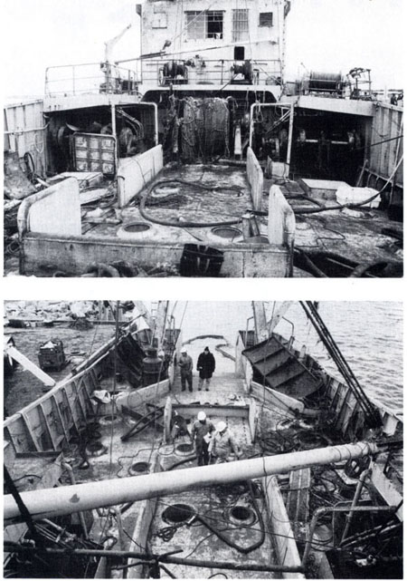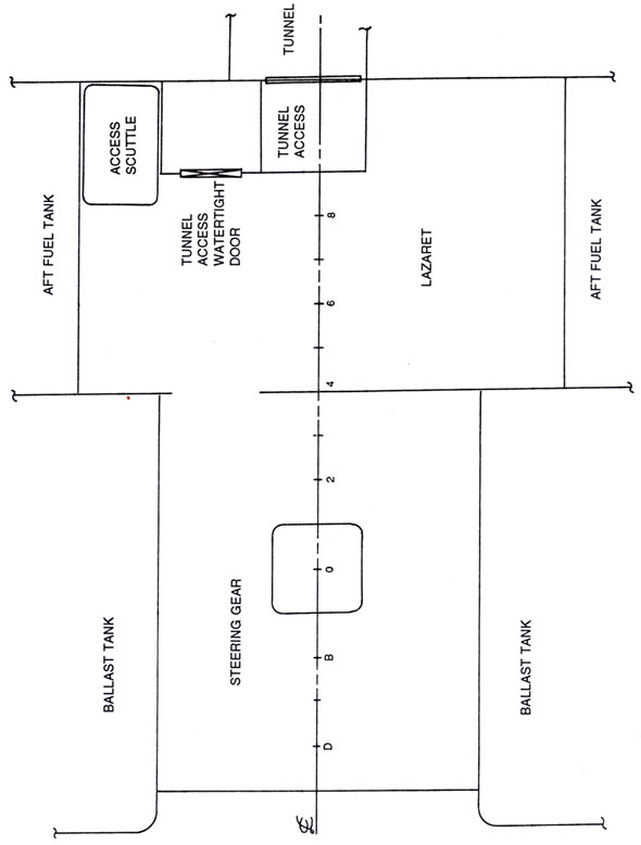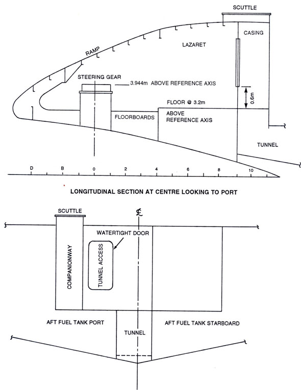 At about 2230, the mate woke the master and told him that there was something wrong, the steering was not working and the vessel was settling in the water. The master went to the bridge and there noted that the rudder angle indicator read 10° to port, that the vessel was veering to the left and listing approximately 20° to port, and that the afterdeck was awash from the goalpost mast on the starboard side to the trawl warp winch on the port side. He immediately ran to check the situation in the engine-room. From the top of the companionway to the engine-room, he asked the chief engineer to pump out the lazaret. The chief engineer, who was at the foot of the companionway looking toward the tunnel's forward entrance, replied that he was doing everything he could.