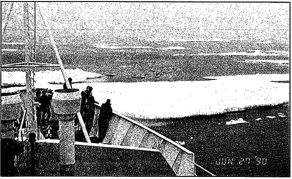 Until 27 June, the vessel was navigated through various ice conditions at various speeds, including areas of open water from which icebergs and bergy bits were observed, to areas in which ice coverage was 10 to 20 per cent, comprising floes of various sizes and composition including multi-year ice.