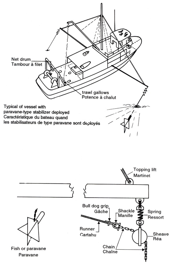 The towing of submerged delta-shaped paravane devices (hereinafter referred to as the stabilizers) suspended from outrigger booms to port and starboard in order to reduce the amplitude of a vessel's roll is now a common and established practice on west coast fishing vessels and has been sporadically introduced on the east coast throughout the past decade.