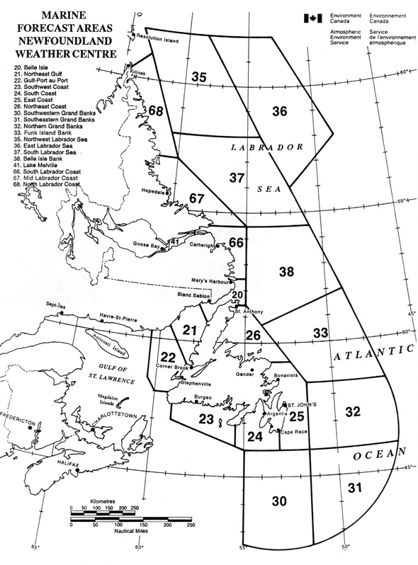 During the passage between the fishing grounds and St. John's, the "STRAITS PRIDE II" was required to transit the east coast marine weather forecast area, and while engaged in fishing in the 3L fishing zone, she would be in the Funk Island Bank and Northern Grand Banks weather forecast areas (see Appendix C) covered by the Newfoundland Weather Centre.