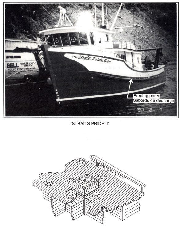 The "STRAITS PRIDE II" was built and inspected in accordance with the Small Fishing Vessel Inspection Regulations made pursuant to the Canada Shipping Act (CSA) for a vessel of that size and tonnage. The vessel's fish hold was divided into 12 pens by portable aluminium penboards. A 1.5 m x 2.2 m hatchway to the fish hold was provided with a scuttle in the after section of the coaming to facilitate loading of fish. Additionally, six flush deck scuttles, two each on the port and starboard sides and one each forward and aft of the main hatchway, were also provided for that purpose. Each scuttle was provided with an aluminium cover which could be secured watertight by a single-action, key-operated closing mechanism. The main aluminium hatchway cover was fitted with an independent watertight access. Access to the lazaret was by means of an aluminium manhole cover provided with a similar watertight closing arrangement.