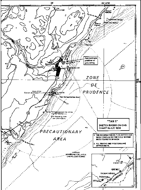 At 2008, the operator of the radarless "TAN 2" reported to the Vessel Traffic Centre (VTC) Les Escoumins that he was no longer able to find his bearings because of the fog. The "TAN 2" was not equipped with any navigational instruments that could have been used to determine her position.