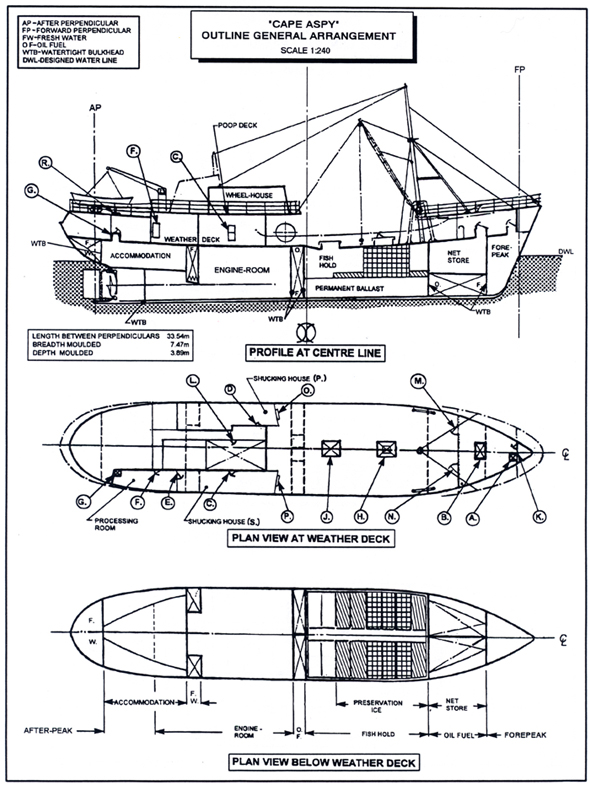 The "CAPE ASPY" was built, registered and rigged for side trawling in 1963, but, in 1977, she was converted into a scallop trawler (dragger). The hull was subdivided by six transverse watertight bulkheads. (For layout see photograph (Appendix A) and Outline General Arrangement (Appendix B).)