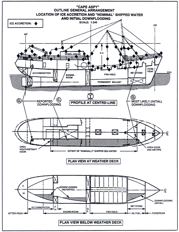 Compliance with STAB. 4 (Appendix E) ensures that large fishing vessels maintain what is generally recognized as adequate intact transverse stability throughout a range of standard loading configurations for normal and winter operations. In winter, when a vessel's stability can be detrimentally affected by the weight of freezing spray (ice) on the upperworks, masts and rigging, approval is based on the vessel's stability exceeding minimum criteria with an assumed regulatory prescribed weight of ice accretion. In the case of the "CAPE ASPY", the regulatory prescribed additional weight amounted to some 32 tonnes.