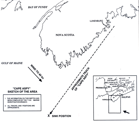 The "CAPE ASPY" departed Lunenburg, Nova Scotia, on 30 January 1993, bound for the Georges Bank fishing g rounds. Approximately 14 hours later, while still en route, the vessel sank in rough weather conditions, in 120 fathoms, in position 42°28.6′N, 65°y58.2′W, with the loss of five lives.