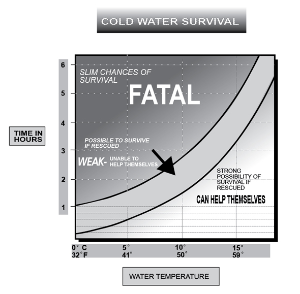 The accompanying graph shows average predicted survival times of average, adult humans in water of different temperatures. The figures are based on experimental cooling of average men and women who were holding still in ocean water and wearing a standard lifejacket and light clothing. The graph shows, for example, that predicted survival time is about 2 ½-3 hours in water of 10°C(50°F). Predicted survival time is increased by extra body fat and decreased by small body size. Although women generally possess slightly more fat than men they cool slightly faster due to their usually small body size. However, for comparable sizes, the man will cool faster.