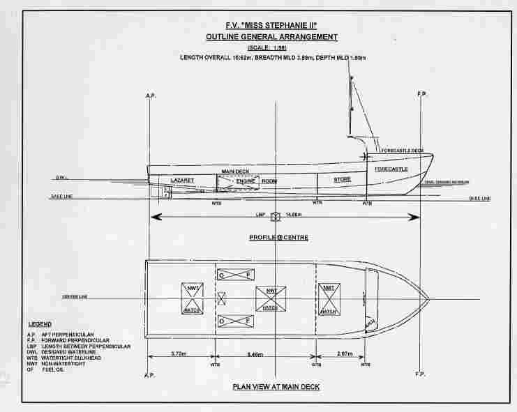 The "MISS STEPHANIE II" is a small fishing vessel of welded steel construction with a sheltered navigation station which is open at its after end. The hull below the main deck is subdivided into four compartments by three transverse watertight bulkheads. The vessel's basic layout is shown in Appendix A - General Arrangement.