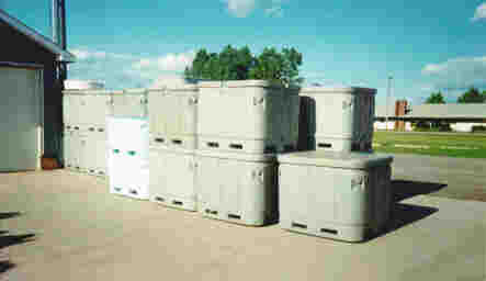The 1545-type fish totes are moulded-plastic, double-walled insulated containers having reinforced internal ribs and rounded corners. Each tote has a capacity of 0.68 m3. Its outside dimensions are 122 cm by 109 cm by 98 cm high, and its empty weight is 75 kg.